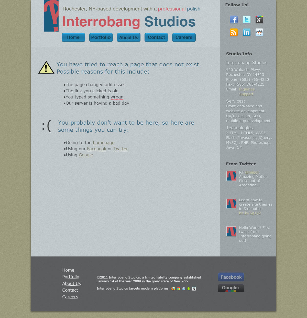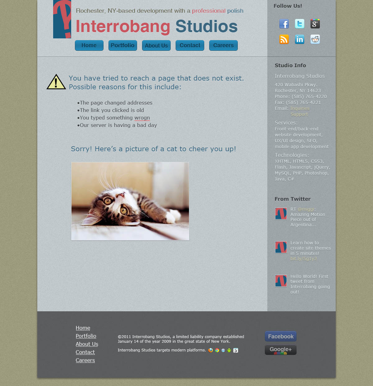 Converging between digital imaging and web design, I was asked to create a web design focused on a "404 Not Found" error page of a site. I created a standard and alternate version—one more serious and one more light-hearted. The project was a lesson in both site design and using Photoshop to convert layouts into code.